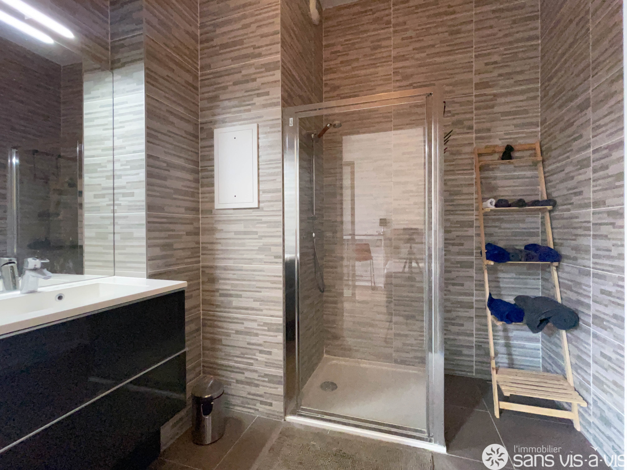 Il comprend : une entrée, un vaste séjour de 25 m2 avec une cuisine ouverte entièrement aménagée et équipée, 3 chambres dont une suite parentale avec salle d'eau, une salle de bains avec wc et un second toilette indépendant.