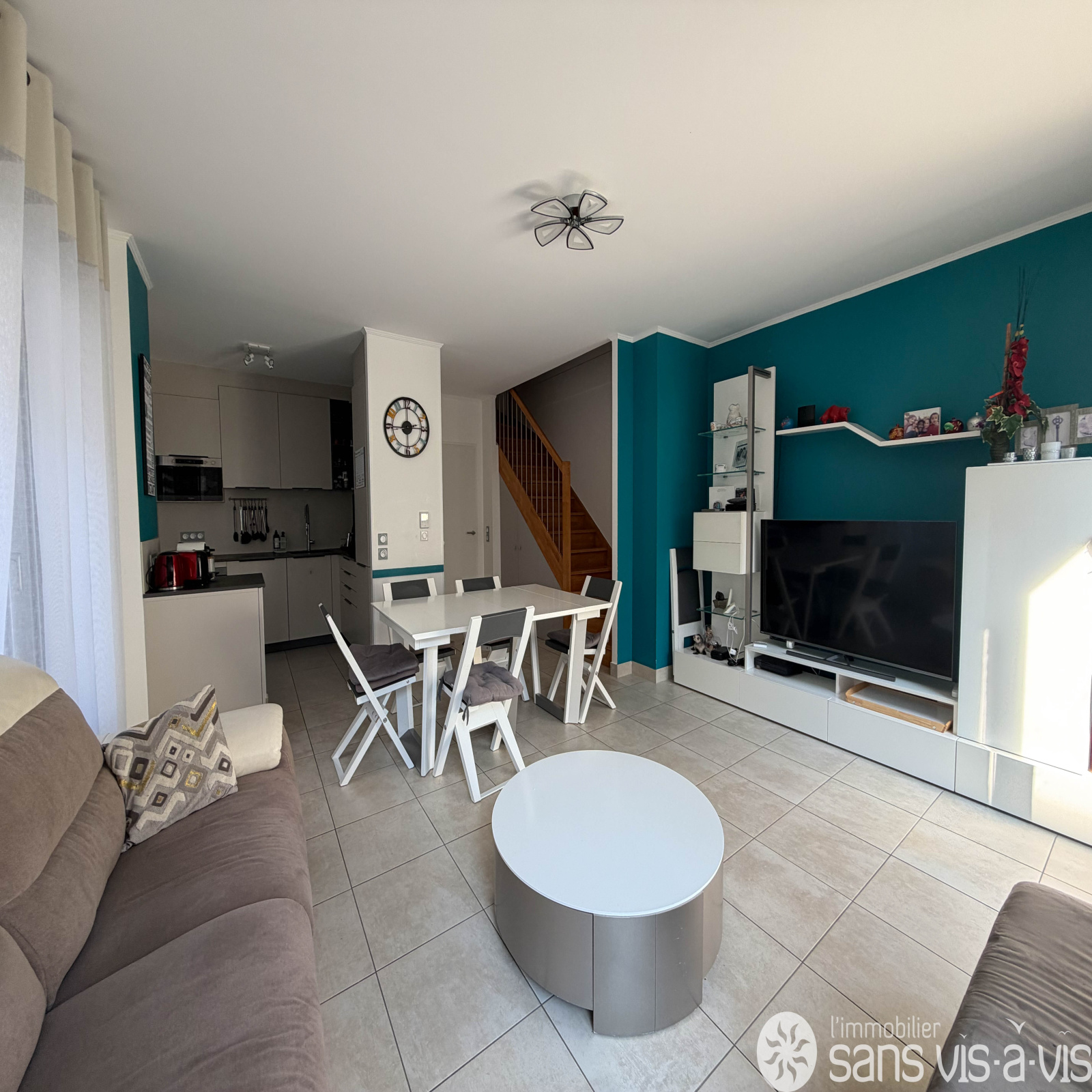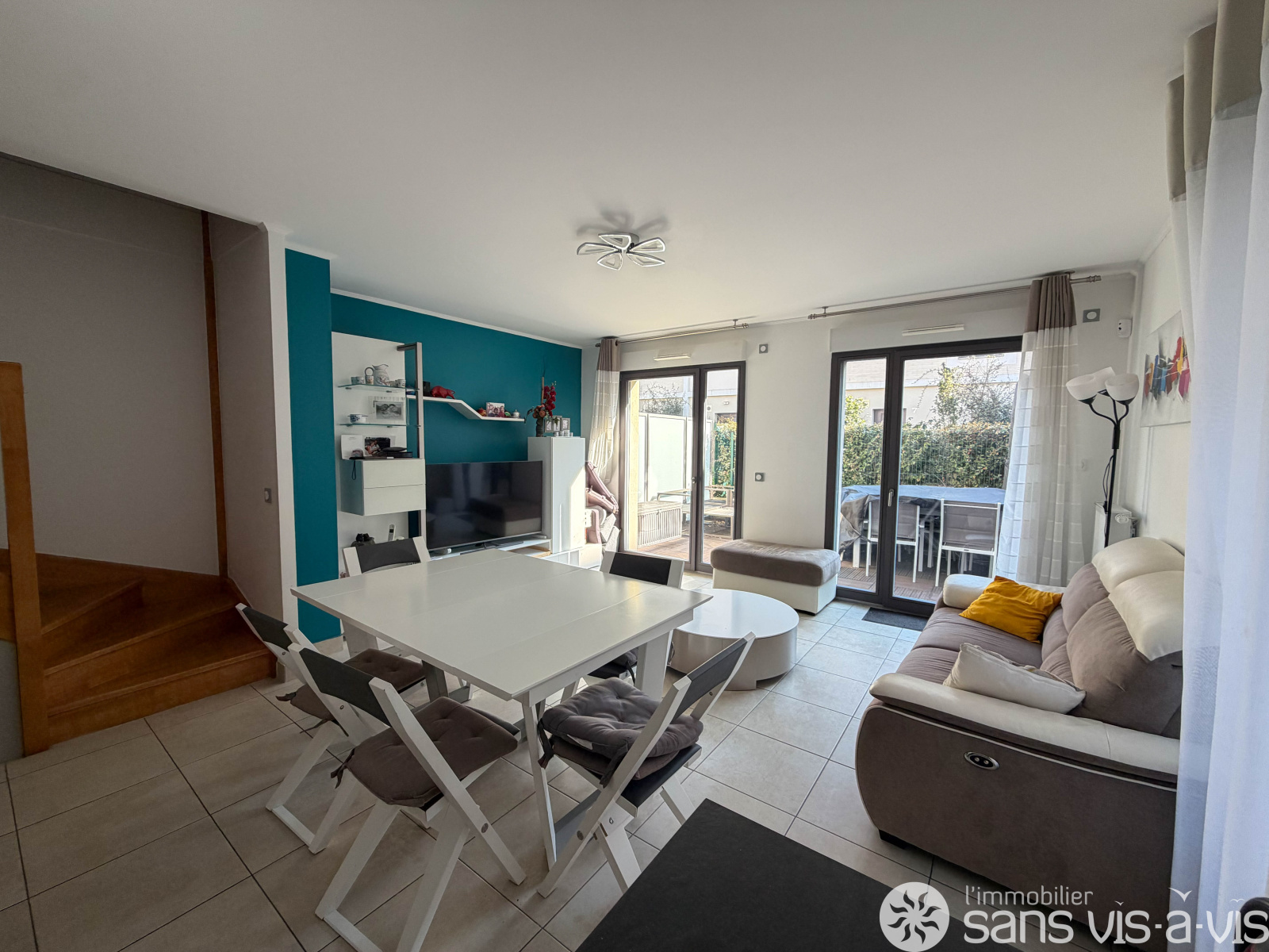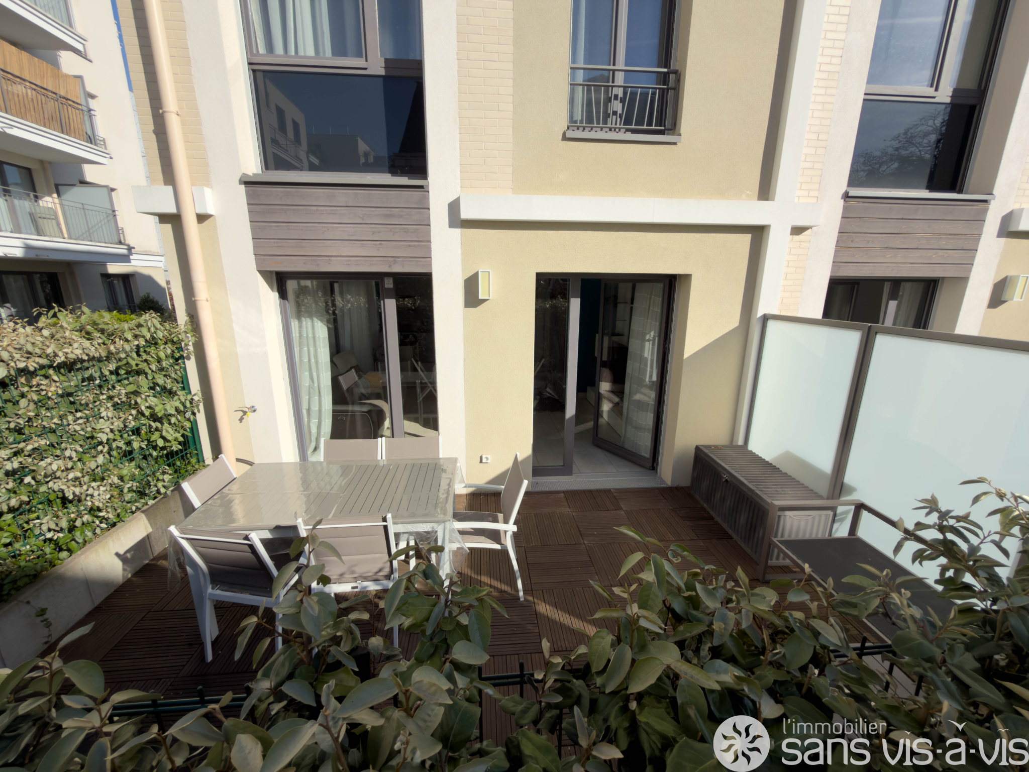 - Au RDC : un jardinet, une entrée, des WC, une grande pièce de vie avec cuisine ouverte donnant accès à une terrasse de 17m2 exposée sud ainsi que de nombreux rangements.