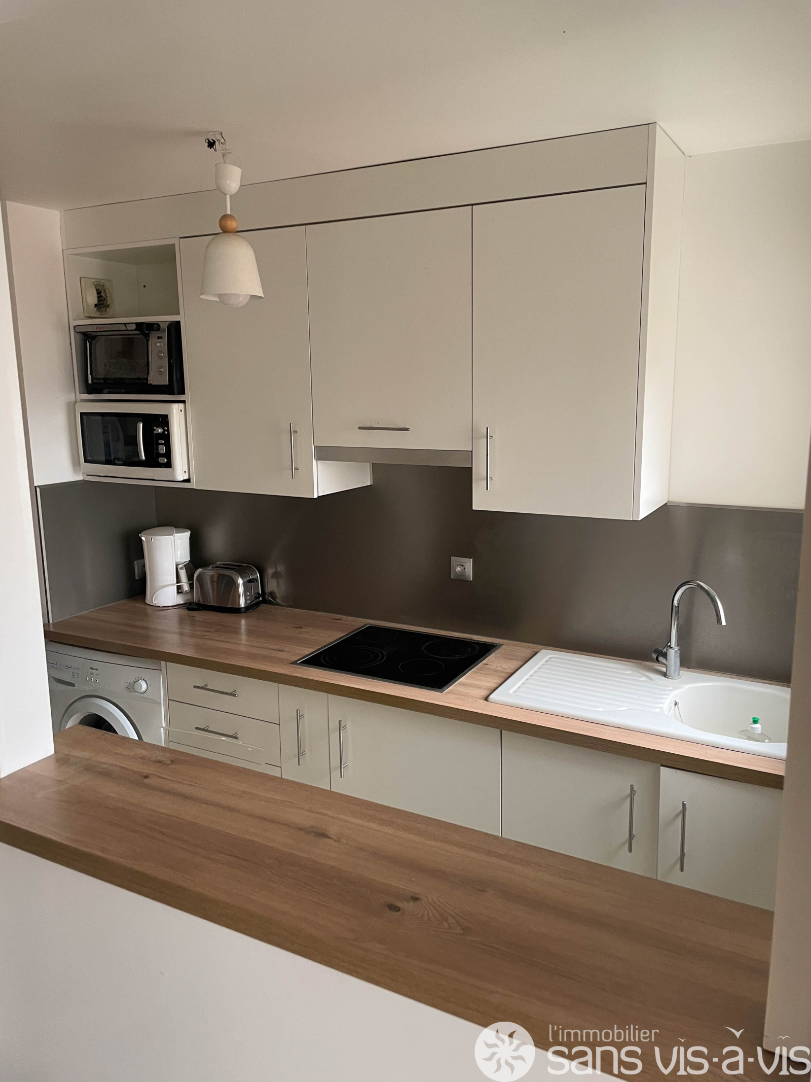 une cuisine séparéé et équipée avec plaque de cuisson , hotte avec un bar suspendu pour déjeuner.